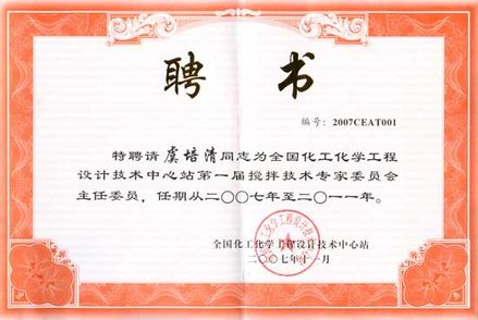 虞培清總經(jīng)理:全國化工化學(xué)工程設(shè)計(jì)技術(shù)中心站攪拌技術(shù)專家委員會(huì)主任委員聘書