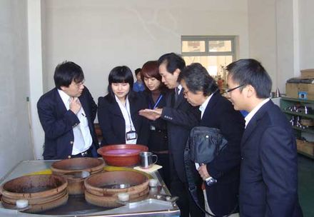 虞培清董事長正在為高橋幸司教授等與會人員解釋產品工藝流程情況