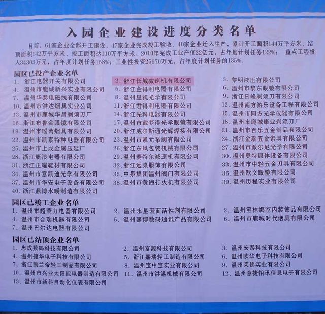 2010年12月31日上午,浙江溫州鹿城輕工產業(yè)園區(qū)入園企業(yè)集體慶典活動在園區(qū)舉行。我公司作為園區(qū)已投產企業(yè)參加了此次活動。 入園企業(yè)建設進度分類名單 以上組圖為活動現場照片