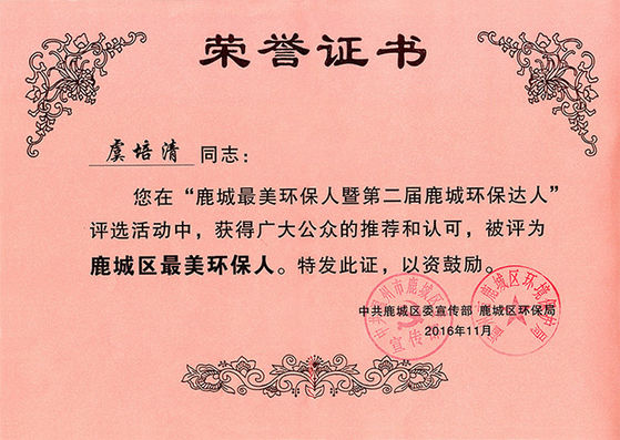 熱烈祝賀我司董事長虞培清被評為“鹿城區(qū)最美環(huán)保人”