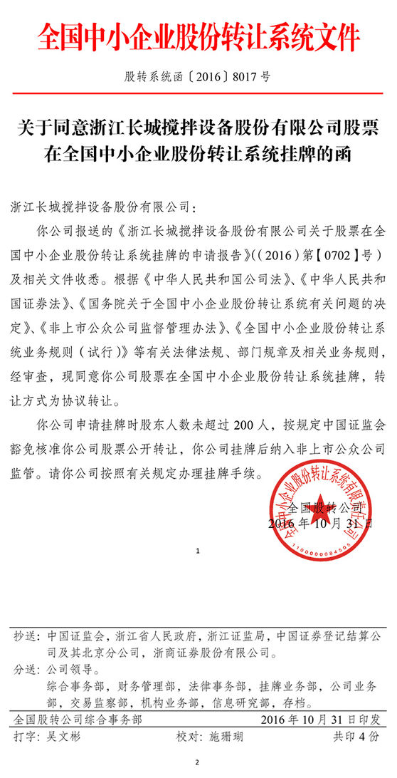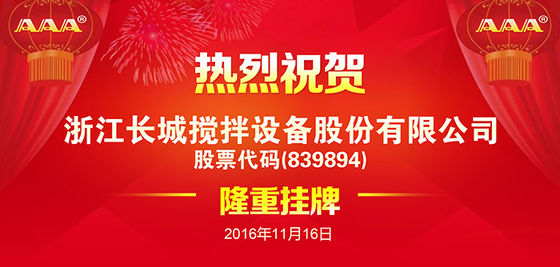 2016年11月16日,浙江長城攪拌設(shè)備股份有限公司,簡稱“長城攪拌”,在“新三板”正式掛牌,股票代碼839894。這是行業(yè)喜訊,也是我們?nèi)w長城人的驕傲。 浙江長城攪拌設(shè)備股份有限公司是國內(nèi)外知名的攪拌技術(shù)開發(fā)與攪拌...